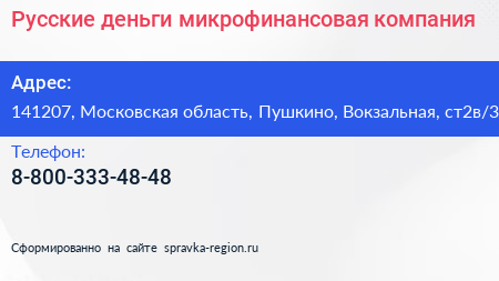 Русские деньги, микрофинансовая компания по адресу 141207, Московская область, Пушкино, Вокзальная, ст2в/3 в дальнейшем Организация, размещена в следующих категориях:
