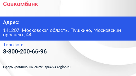 Совкомбанк по адресу 141207, Московская область, Пушкино, Московский проспект, 44 в дальнейшем Организация, размещена в следующих категориях: