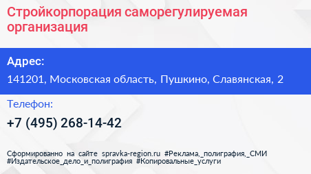 Стройкорпорация, саморегулируемая организация по адресу 141201, Московская область, Пушкино, Славянская, 2 в дальнейшем Организация, размещена в следующих категориях: