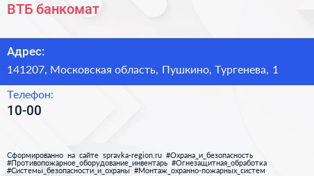 ВТБ, банкомат по адресу 141207, Московская область, Пушкино, Тургенева, 1 в дальнейшем Организация, размещена в следующих категориях: