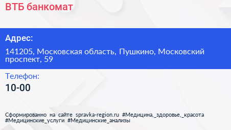 ВТБ, банкомат по адресу 141205, Московская область, Пушкино, Московский проспект, 59 в дальнейшем Организация, размещена в следующих категориях: