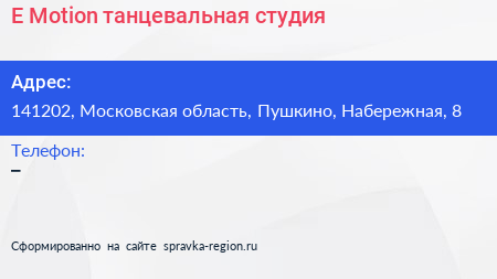 E-Motion, танцевальная студия по адресу 141202, Московская область, Пушкино, Набережная, 8 в дальнейшем Организация, размещена в следующих категориях: