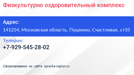 Физкультурно-оздоровительный комплекс по адресу 141254, Московская область, Пушкино, Счастливая, ст35 в дальнейшем Организация, размещена в следующих категориях: