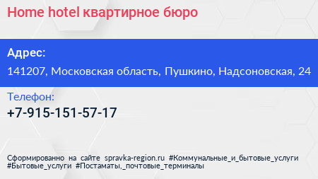 Home hotel, квартирное бюро по адресу 141207, Московская область, Пушкино, Надсоновская, 24 в дальнейшем Организация, размещена в следующих категориях: