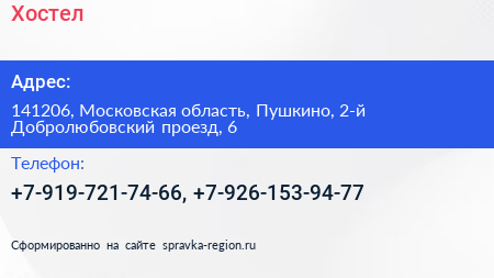 Хостел по адресу 141206, Московская область, Пушкино, 2-й Добролюбовский проезд, 6 в дальнейшем Организация, размещена в следующих категориях: