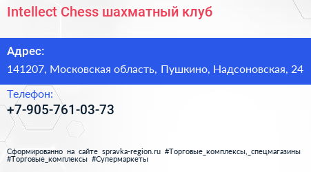 Intellect Chess, шахматный клуб по адресу 141207, Московская область, Пушкино, Надсоновская, 24 в дальнейшем Организация, размещена в следующих категориях:
