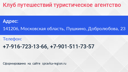 Клуб путешествий, туристическое агентство по адресу 141206, Московская область, Пушкино, Добролюбова, 23 в дальнейшем Организация, размещена в следующих категориях: