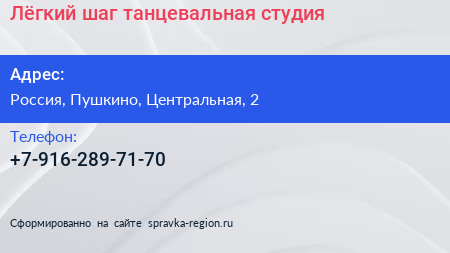 Лёгкий шаг, танцевальная студия по адресу Дом культуры "Современник", 22А, улица Комбикормовый завод, Лесные Поляны, Пушкинский городской округ, Московская область, Центральный федеральный округ, 141212, Россия в дальнейшем Организация, размещена в следующих категориях: