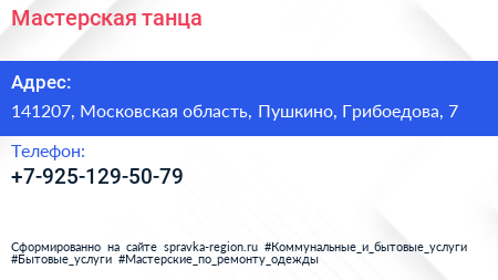 Мастерская танца по адресу 141207, Московская область, Пушкино, Грибоедова, 7 в дальнейшем Организация, размещена в следующих категориях: