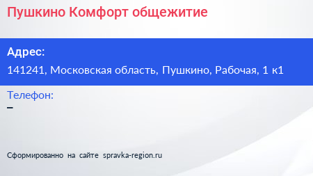 Пушкино-Комфорт, общежитие по адресу 141241, Московская область, Пушкино, Рабочая, 1 к1 в дальнейшем Организация, размещена в следующих категориях: