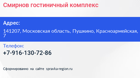 Смирнов, гостиничный комплекс по адресу 141207, Московская область, Пушкино, Красноармейская, 7 в дальнейшем Организация, размещена в следующих категориях: