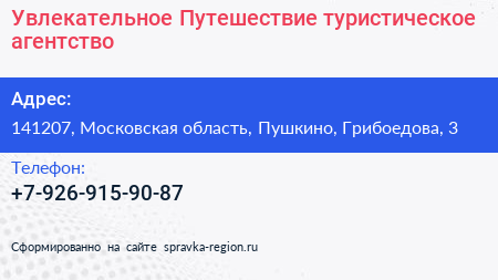 Увлекательное Путешествие, туристическое агентство по адресу 141207, Московская область, Пушкино, Грибоедова, 3 в дальнейшем Организация, размещена в следующих категориях: