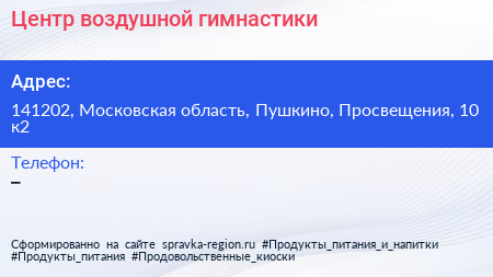 Центр воздушной гимнастики по адресу 141202, Московская область, Пушкино, Просвещения, 10 к2 в дальнейшем Организация, размещена в следующих категориях: