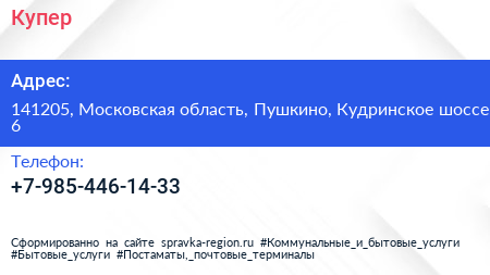Купер по адресу 141205, Московская область, Пушкино, Кудринское шоссе, 6 в дальнейшем Организация, размещена в следующих категориях: