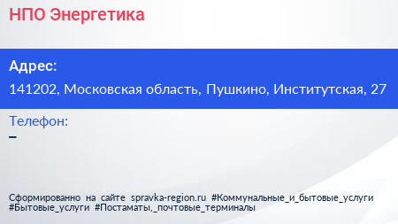 НПО Энергетика по адресу 141202, Московская область, Пушкино, Институтская, 27 в дальнейшем Организация, размещена в следующих категориях: