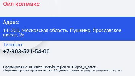 Ойл-колмакс по адресу 141201, Московская область, Пушкино, Ярославское шоссе, 2в в дальнейшем Организация, размещена в следующих категориях: