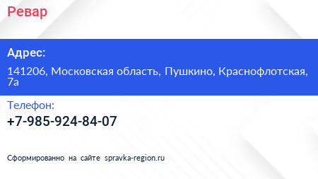 Ревар по адресу 141206, Московская область, Пушкино, Краснофлотская, 7а в дальнейшем Организация, размещена в следующих категориях: