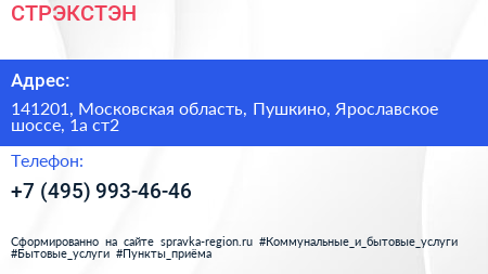 СТРЭКСТЭН по адресу 141201, Московская область, Пушкино, Ярославское шоссе, 1а ст2 в дальнейшем Организация, размещена в следующих категориях: