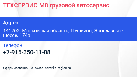 ТЕХСЕРВИС М8, грузовой автосервис по адресу 141202, Московская область, Пушкино, Ярославское шоссе, 174а в дальнейшем Организация, размещена в следующих категориях: