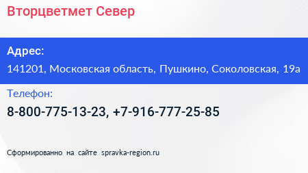 Вторцветмет Север по адресу 141201, Московская область, Пушкино, Соколовская, 19а в дальнейшем Организация, размещена в следующих категориях: