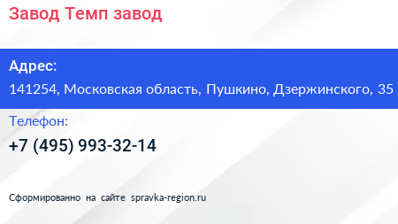 Завод Темп, завод по адресу 141254, Московская область, Пушкино, Дзержинского, 35 в дальнейшем Организация, размещена в следующих категориях: