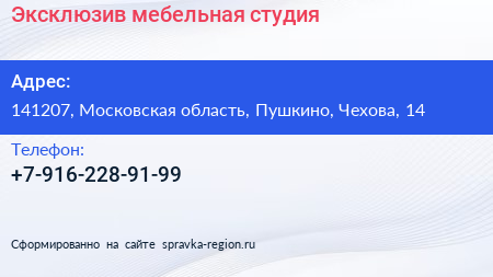 Эксклюзив, мебельная студия по адресу 141207, Московская область, Пушкино, Чехова, 14 в дальнейшем Организация, размещена в следующих категориях: