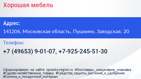 Хорошая мебель по адресу 141206, Московская область, Пушкино, Заводская, 20 в дальнейшем Организация, размещена в следующих категориях: