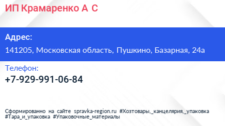 ИП Крамаренко А.С. по адресу 141205, Московская область, Пушкино, Базарная, 24а в дальнейшем Организация, размещена в следующих категориях: