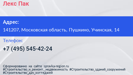 Лекс Пак по адресу 141207, Московская область, Пушкино, Учинская, 14 в дальнейшем Организация, размещена в следующих категориях: