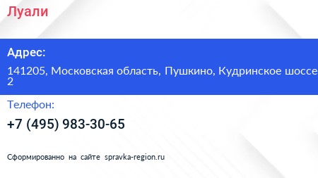 Луали по адресу 141205, Московская область, Пушкино, Кудринское шоссе, 2 в дальнейшем Организация, размещена в следующих категориях: