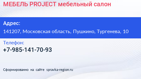 МЕБЕЛЬ PROJECT, мебельный салон по адресу 141207, Московская область, Пушкино, Тургенева, 10 в дальнейшем Организация, размещена в следующих категориях: