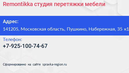 Remontikka, студия перетяжки мебели по адресу 141205, Московская область, Пушкино, Набережная, 35 к1 в дальнейшем Организация, размещена в следующих категориях: