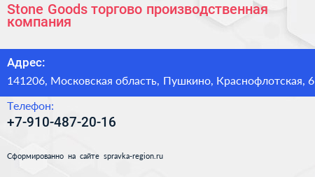 Stone-Goods, торгово-производственная компания по адресу 141206, Московская область, Пушкино, Краснофлотская, 6 в дальнейшем Организация, размещена в следующих категориях:
