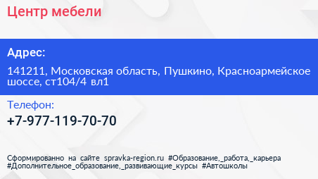 Центр мебели по адресу 141211, Московская область, Пушкино, Красноармейское шоссе, ст104/4 вл1 в дальнейшем Организация, размещена в следующих категориях: