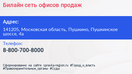 Билайн, сеть офисов продаж по адресу 141205, Московская область, Пушкино, Пушкинское шоссе, 4а в дальнейшем Организация, размещена в следующих категориях: