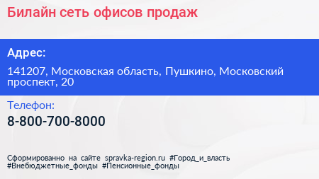 Билайн, сеть офисов продаж по адресу 141207, Московская область, Пушкино, Московский проспект, 20 в дальнейшем Организация, размещена в следующих категориях: