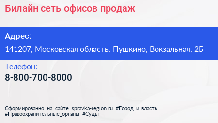 Билайн, сеть офисов продаж по адресу 141207, Московская область, Пушкино, Вокзальная, 2Б в дальнейшем Организация, размещена в следующих категориях: