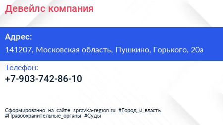 Девейлс, компания по адресу 141207, Московская область, Пушкино, Горького, 20а в дальнейшем Организация, размещена в следующих категориях: