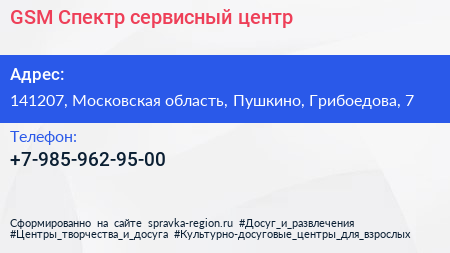 GSM-Спектр, сервисный центр по адресу 141207, Московская область, Пушкино, Грибоедова, 7 в дальнейшем Организация, размещена в следующих категориях: