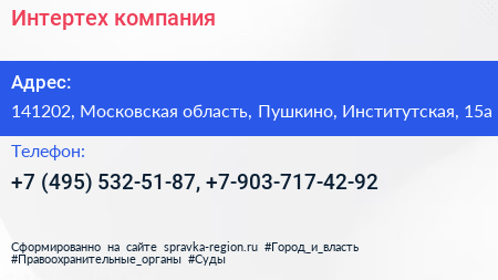 Интертех, компания по адресу 141202, Московская область, Пушкино, Институтская, 15а в дальнейшем Организация, размещена в следующих категориях:
