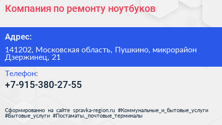 Компания по ремонту ноутбуков по адресу 141202, Московская область, Пушкино, микрорайон Дзержинец, 21 в дальнейшем Организация, размещена в следующих категориях:
