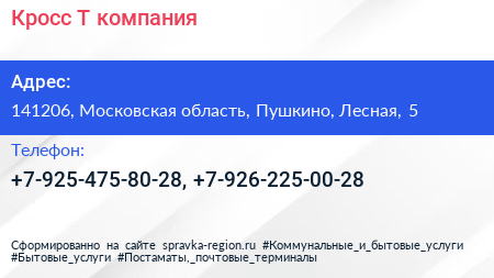 Кросс-Т, компания по адресу 141206, Московская область, Пушкино, Лесная, 5 в дальнейшем Организация, размещена в следующих категориях: