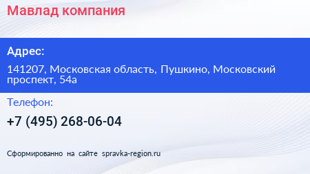 Мавлад, компания по адресу 141207, Московская область, Пушкино, Московский проспект, 54а в дальнейшем Организация, размещена в следующих категориях: