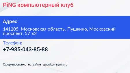PiNG, компьютерный клуб по адресу 141205, Московская область, Пушкино, Московский проспект, 57 к2 в дальнейшем Организация, размещена в следующих категориях: