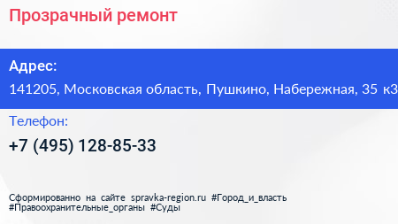 Прозрачный ремонт по адресу 141205, Московская область, Пушкино, Набережная, 35 к3 в дальнейшем Организация, размещена в следующих категориях: