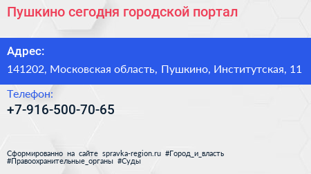 Пушкино сегодня, городской портал по адресу 141202, Московская область, Пушкино, Институтская, 11 в дальнейшем Организация, размещена в следующих категориях: