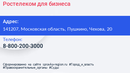 Ростелеком для бизнеса по адресу 141207, Московская область, Пушкино, Чехова, 20 в дальнейшем Организация, размещена в следующих категориях: