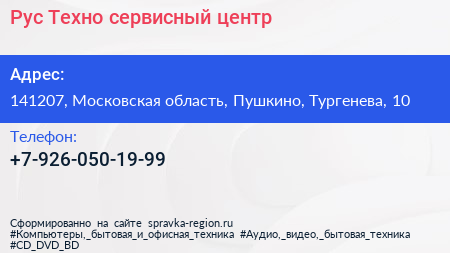 Рус Техно, сервисный центр по адресу 141207, Московская область, Пушкино, Тургенева, 10 в дальнейшем Организация, размещена в следующих категориях:
