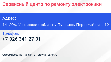 Сервисный центр по ремонту электроники по адресу 141206, Московская область, Пушкино, Первомайская, 12 в дальнейшем Организация, размещена в следующих категориях: