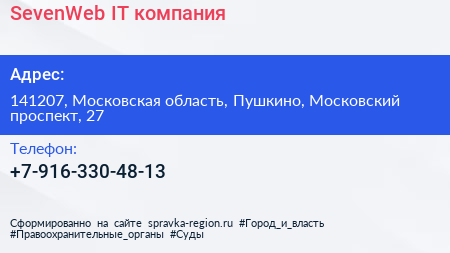 SevenWeb, IT-компания по адресу 141207, Московская область, Пушкино, Московский проспект, 27 в дальнейшем Организация, размещена в следующих категориях:
